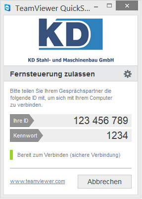 Damit sich Ihr Gesprächspartner mit Ihrem Computer verbinden kann, teilen Sie ihm bitte die in Ihrem Programm angezeigte "Ihre ID" und das "Kennwort" mit.
